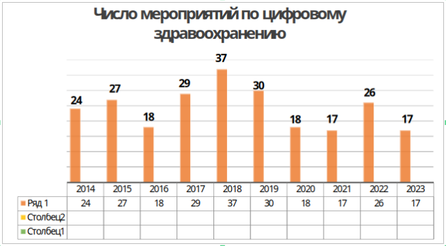 Любой реальный график, как правило, не выглядит, как некая идеальная предполагаемая кривая. На нашем графике просматривается безусловный пик 2017-2019 годов. Полагаю, что пик 2022 года связан с определенным постковидным оживлением (захотелось поговорить и пообщаться). Но постоянное снижение в последние годы числа специализированных мероприятий по цифровому здравоохранению совсем не радует. Посмотрим, что ожидает нас в 2026 году и далее.